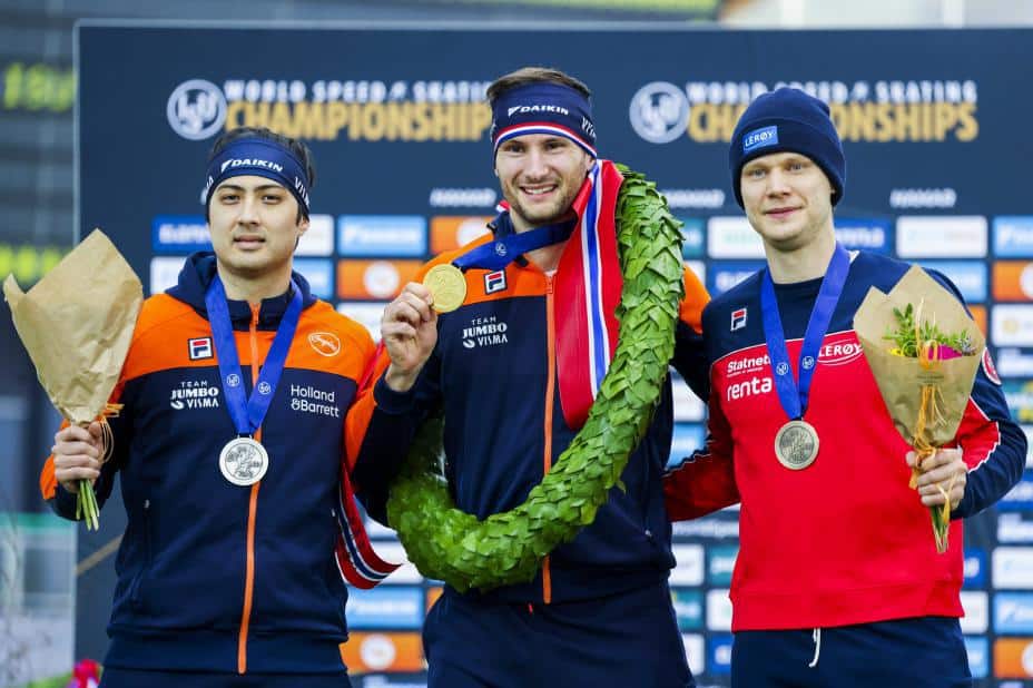 Håvard Lorentzen (til h.) med bronsemedalje i sprint-VM ved siden av verdensmester Thomas Krol og sølvvinner Kai Verbij. Foto: Geir Olsen / NTB