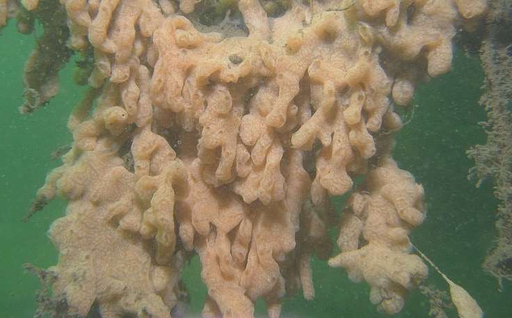 Havnespy: Sjøpungen Didemnum vexillum, også kalt «havnespy» er funnet flere steder i Haugesund og Nord-Karmøy.
