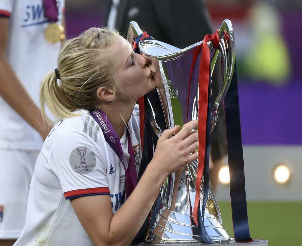 Denne sesongen har hun 31 mål på 26 kamper. Ikke rart at det var Hegerberg som bar pokalen inn i rommet da Lyon natt til søndag kom til hjembyen for å fortsette feiringen.