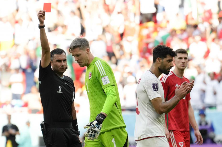 Wales-keeper Wayne Hennessey ble første spiller i årets fotball-VM til å bli utvist. Han fikk marsjordre etter en stygg takling mot Iran fredag.