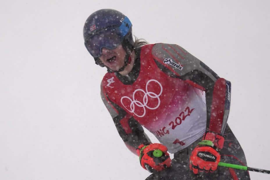 Henrik Kristoffersen var førstemann i aksjon i OL-rennet i storslalåm. Tiden holder til 4.-plass etter første omgang i snøværet, 12 hundredeler bak lederen.