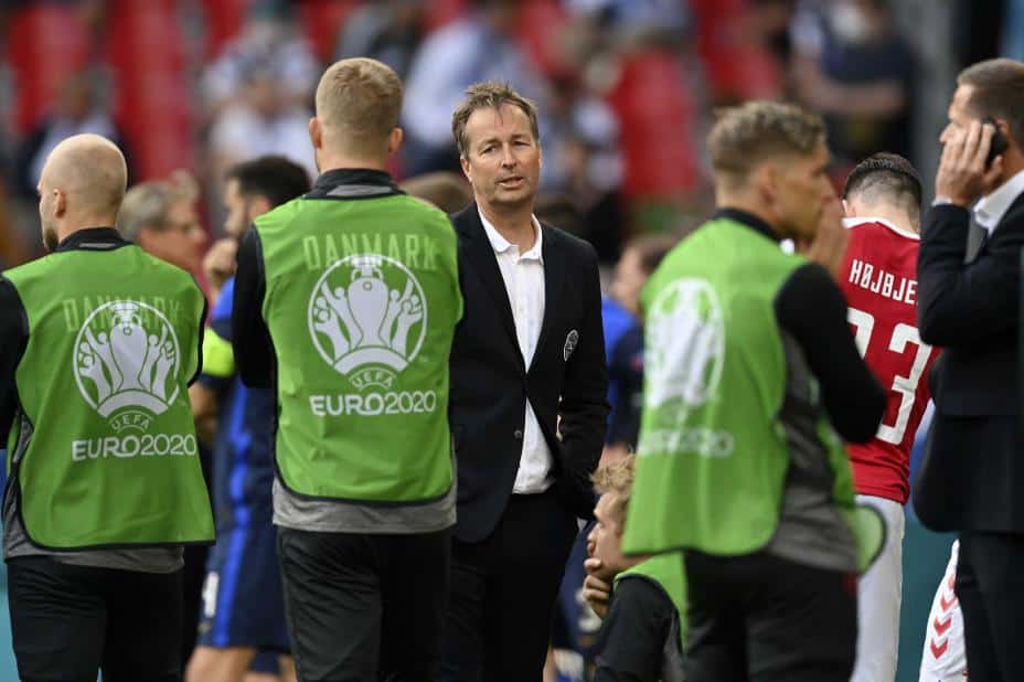 Danmarks landslagssjef Kasper Hjulmand kjempet med tårene under pressekonferansen etter åpningskampen i EM. Tankene var hos Christian Eriksen.