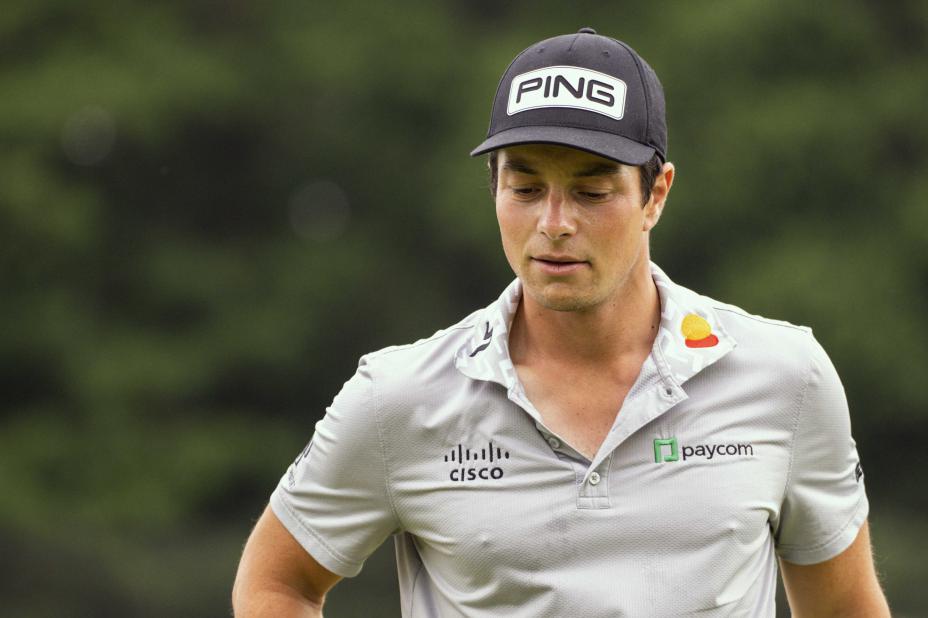 Viktor Hovland slo tidvis gode slag i starten av Scottish Open, men hadde litt stang ut med putteren og brukte totalt 74 slag. Det er fire slag over par.