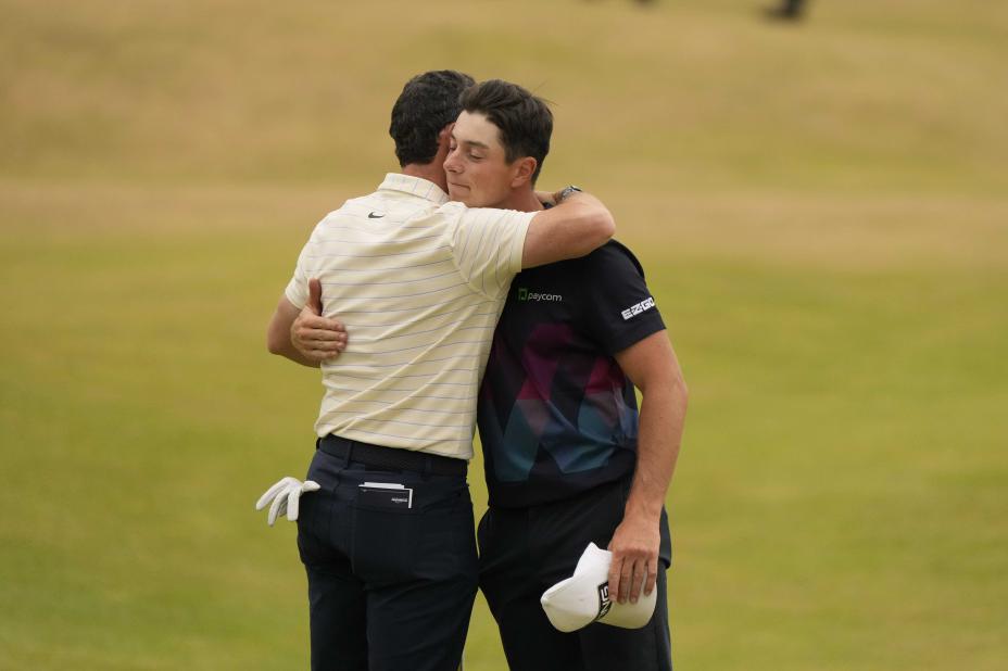 Viktor Hovland (t.h.) og Rory McIlroy klemmer hverandre etter at begge kom til kort i seierskampen i British Open søndag. Foto: Gerald Herbert / AP / NTB