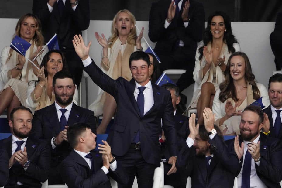 Viktor Hovland under presentasjonen før Ryder Cup i golf. Han er første nordmann som deltar i prestisjeturneringen. Foto: Jeff Roberson, AP / NTB