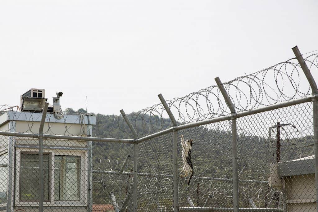 En katt prøver å klatre over piggtrådgjerdene i Moria-leiren på Lesvos i 2016. Arkivfoto: Tore Meek / NTB scanpix
