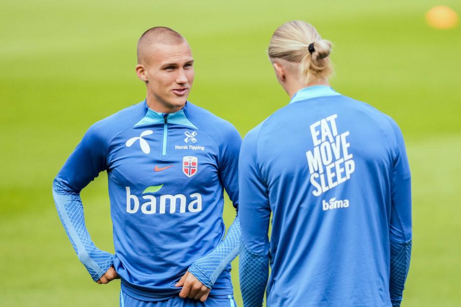 Leo Østigård og Erling Braut Haaland under landslagstrening før bortekampen mot Slovenia. Foto: Beate Oma Dahle / NTB