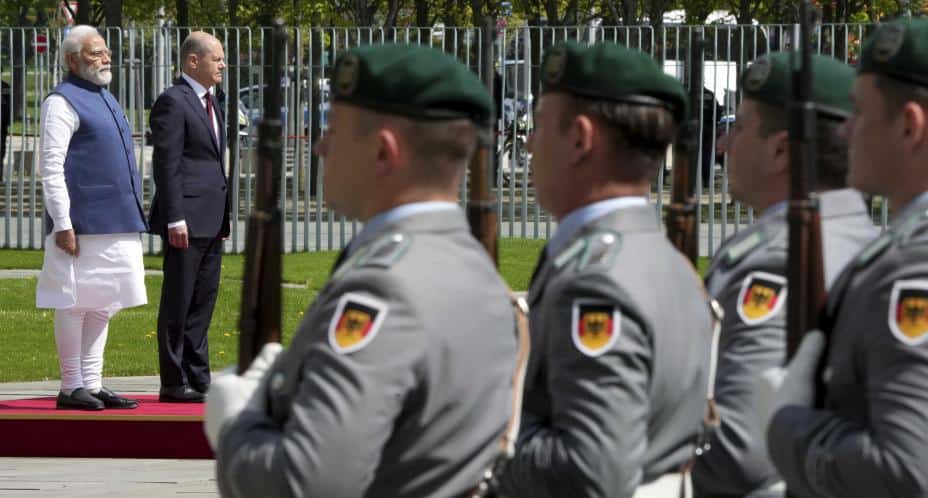 Politikk: Modi ankom Tyskland mandag. Her ble han ønsket velkommen av den tyske statsministeren Olaf Scholtz.