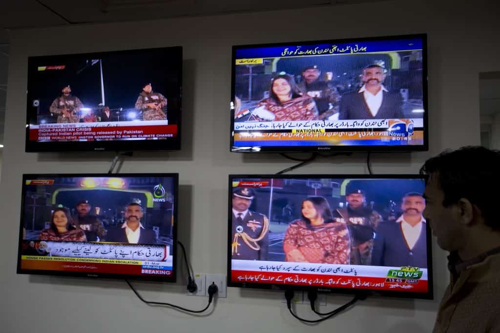 Overleveringen av flygeren Abhinandan Varthaman ble fulgt av et stort presseoppbud og ble naturlig nok også direktesendt på TV. Foto: B.K. Bangash / AP / NTB scanpix