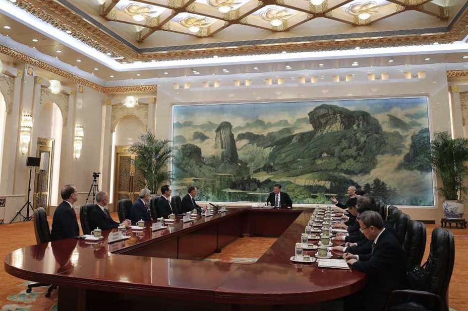 Kinas president Xi Jinping (i midten) møtte den amerikanske handelsutsendingen Robert Robert Lighthizer, USAs finansminister Steven Mnuchin og resten av den amerikanske delegasjonen i Beijing fredag. Foto: AP / Andy Wong / NTB scanpix