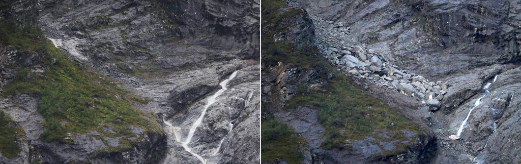 Montasje av bilder tatt før og etter at store deler av fjellpartiet Veslemannen raste ut torsdag kveld. Bildet til venstre er tatt torsdag ettermiddag, bildet til høyre fredag morgen. Foto: Ørn E. Borgen / NTB scanpix