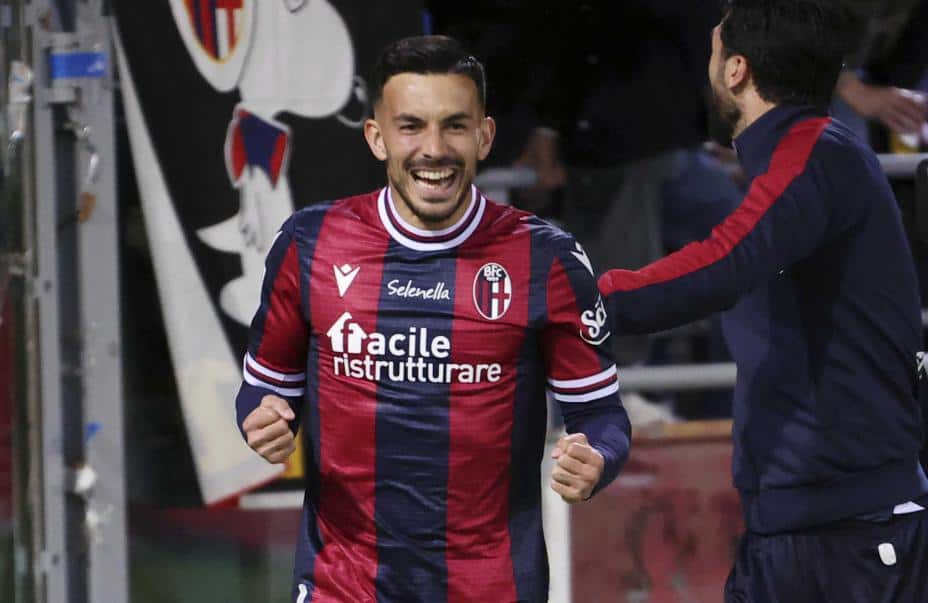 Bolognas Nicola Sansone ble matchvinner mot Inter. Dermed er det Milan som fortsatt er i føringen i serie A. Foto: Michele Nucci / LaPresse via AP / NTB