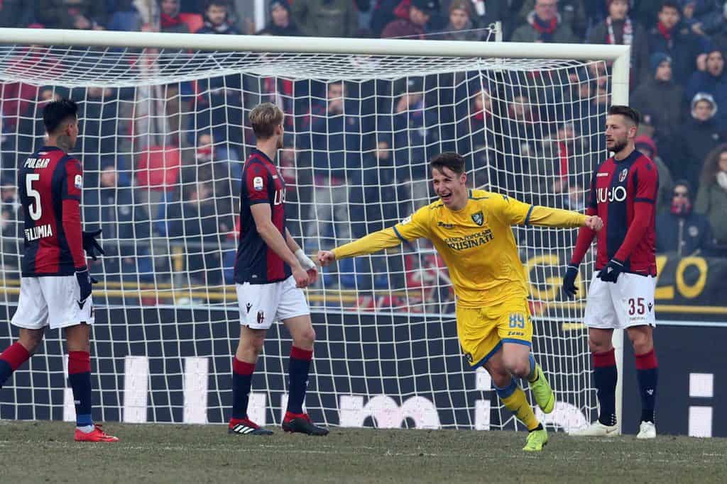 Bolognas ydmykende hjemmetap mot Frosinone i søndagens bunnoppgjør ble siste kamp for trener Filippo Inzaghi, som mandag ble erstattet av Sinisa Mihajlovic. Her feirer Andrea Pinamonti scoring for Frosinone. Foto: Giorgio Benvenuti, ANSA via AP / NTB scanpix