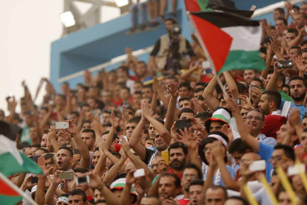 Palestinske fotballsupportere heier under en VM-kvalifiseringskamp på Al-Ram-stadion i 2015. Israel nekter å gi innreisetillatelse til de fleste av spillerne på et fotballag fra Gaza som etter planen skulle spilt palestinsk cupfinale på Vestbredden denne uka. Arkivfoto: Majdi Mohammed / AP / NTB scanpix
