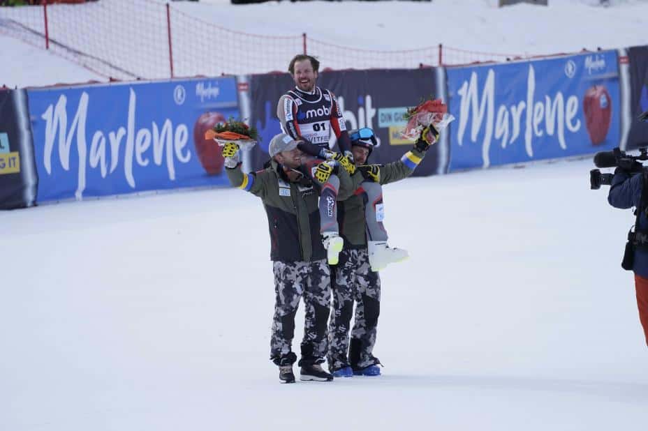 Like etter at Jansrud var kommet i mål, la arrangøren inn en pause slik at han kunne hylles skikkelig. «You’ll Never Walk Alone», en kjent supportersang i Jansruds favorittlag Liverpool, runget over anlegget, og alpinveteranen bøyde seg ned og kysset snøen i målområdet før han ble tatt imot med blomster og klemmer.