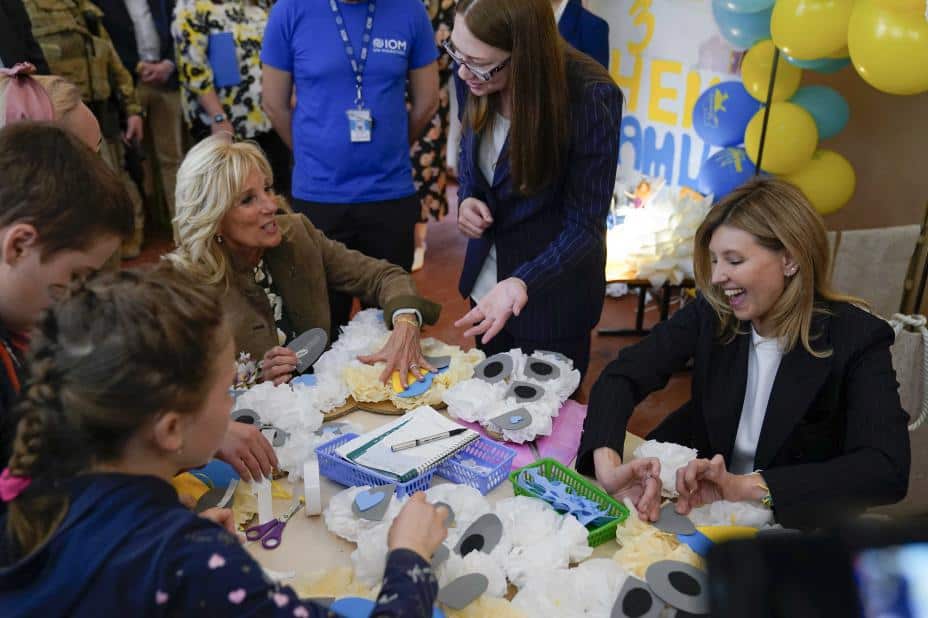 Jill Biden reiste også innom en skole som har tatt inn elever fra Ukraina, der slovakiske og ukrainske mødre markerte morsdagen sammen søndag. Her gikk hun fra bord til bord for å uttrykke støtte.
