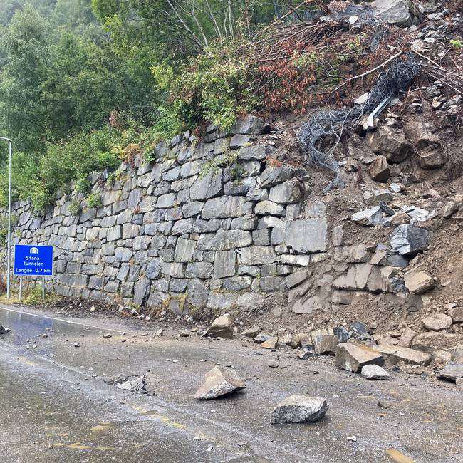 Det er ikkje meldt om at biler er tatt av raset, men to biler skal ha passert bare sekunder før steinmassene raste ned i veibanen.