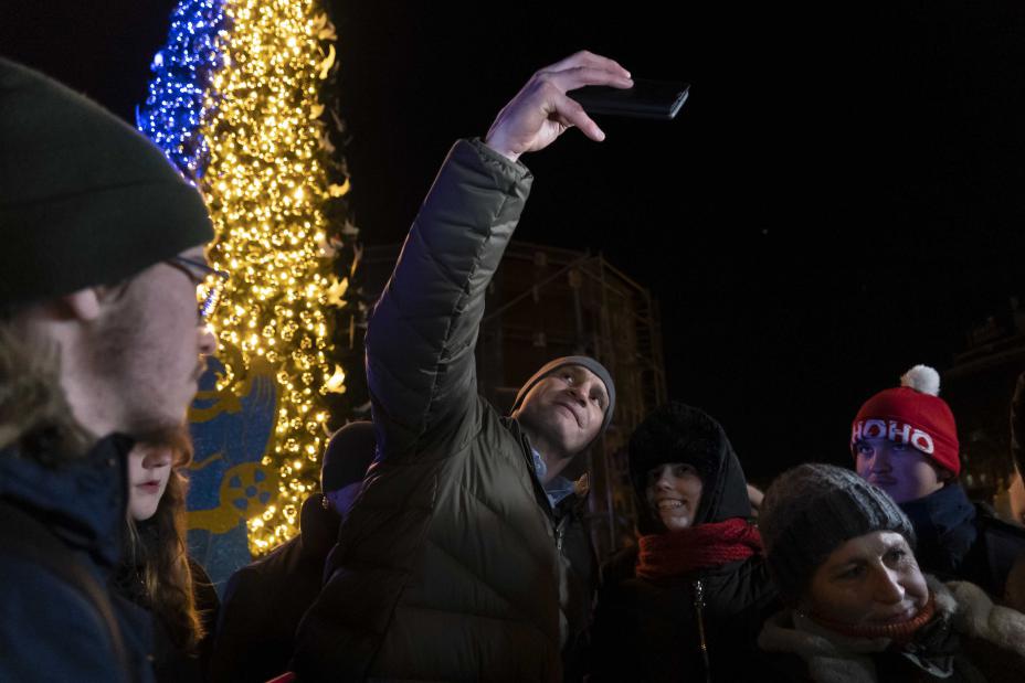 Kyivs ordfører Vitalij Klitsjko stilte opp på selfier sammen med noen av dem som var møtt opp for å se på julegrana i Kyiv. Foto: Vasilisa Stepanenko / AP / NTB