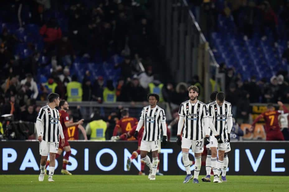 Juventus-spillerne var langt nede etter at Roma scoret sitt tredje mål. Foto: Alessandra Tarantino / AP / NTB