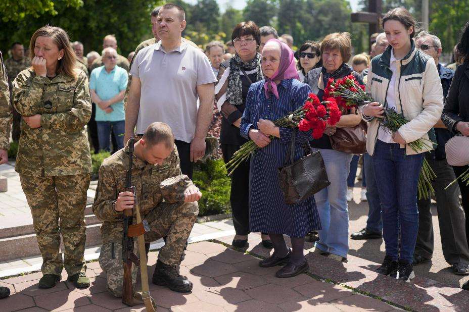 Politikk: I Zjytomyr satte en soldat seg i knestående for å si et siste farvel til Oleksander Makatsjek, en av de mange ukrainske soldatene som er drept. Det dør rundt 100 ukrainske soldater hver dag nå, ifølge president Volodymyr Zelenskyj.