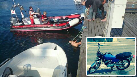 Mannen som havnet i vannet fikk hjelp av Røde Kors til å komme seg i land. Det var motorsykkelen til høyre i bildet som ble kjørt på sjøen. FOTO: Kjell Bua/Privat.