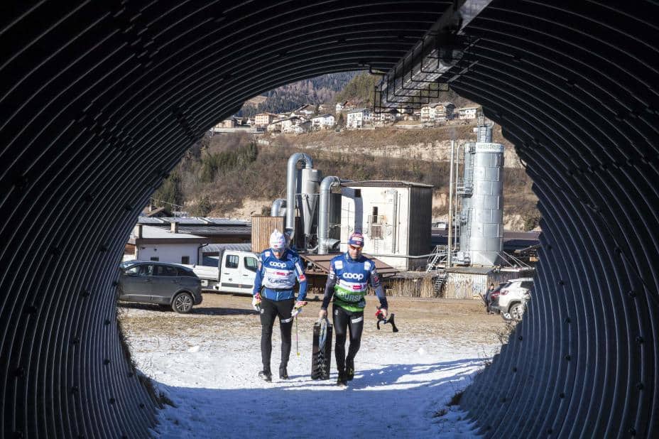 Johannes Høsflot Klæbo (t.v.) sammen med skismører Frode Pedersen i Tour de Ski i 2019. Foto: Terje Pedersen / NTB