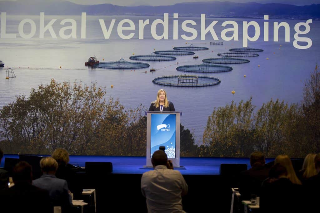 Fredag kveld sa Høyres landsmøte et klart og tydelig nei til å innføre grunnrenteskatt, såkalt lakseskatt, på havbruk. Foto: Vidar Ruud / NTB scanpix