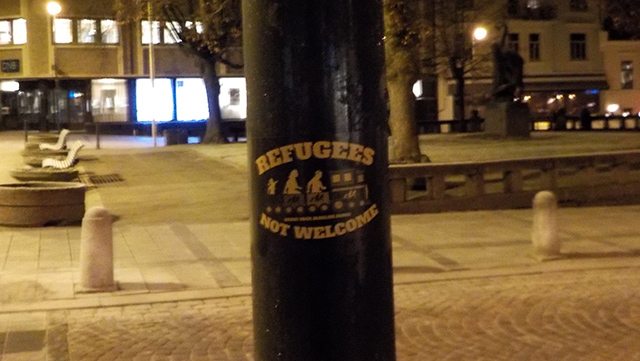 I løpet av natten hadde noen tatt seg friheter med Hnytt sine biler og klistret på Refugees Not Welcome merker. De ble nok en gang kjapt fjernet.