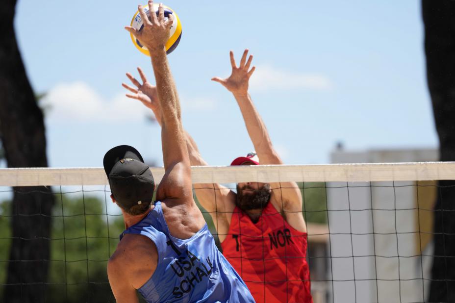 Hendrik Mol i duell mot amerikanske Chaim Schalk i Mol/Berntsens første kamp i VM i sandvolleyball. Foto: Andrew Medichini / AP / NTB