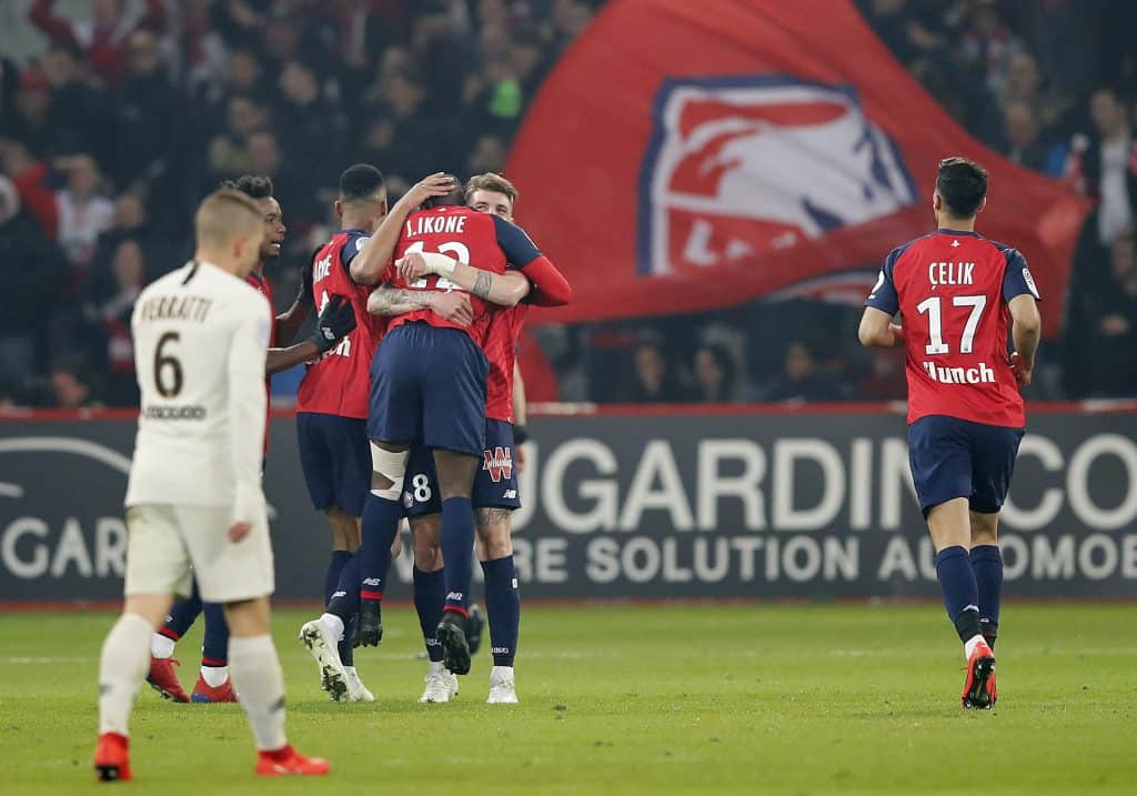 Lille-spillerne hadde god grunn til å feire etter storseieren over PSG søndag kveld. Foto: Christophe Ena / AP / NTB scanpix