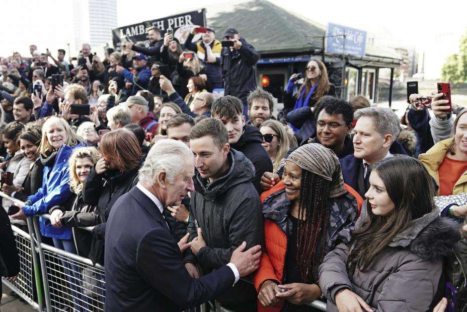 Kuriosa og kjendiser: Ved Lambeth Bridge håndhilste den nye kongen og arvingen og pratet med folk som hadde stått tålmodig i kø gjennom natten.