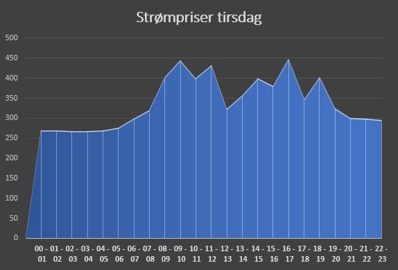 Strømkrise-kommentar: Minsteprisen natt til tirsdag blir på 267 øre per kWh, store deler av dagen vil prisen ligge helt oppe i 447 øre tirsdag. Dette drar snittprisen helt opp i 336 øre per kWh.