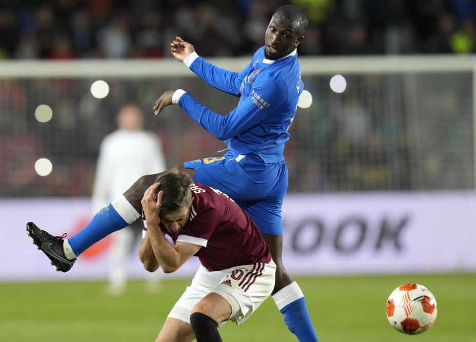 Glen Kamara, her i duell med Sparta Prahas Michal Sacek, ble buet på gjennom hele kampen fram til han ble utvist etter 74 minutter. Foto: Petr David Josek / AP / NTB
