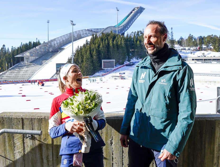 Therese Johaug og kronprins Haakon etter tremila i Holmenkollen. Foto: Lise Åserud / NTB