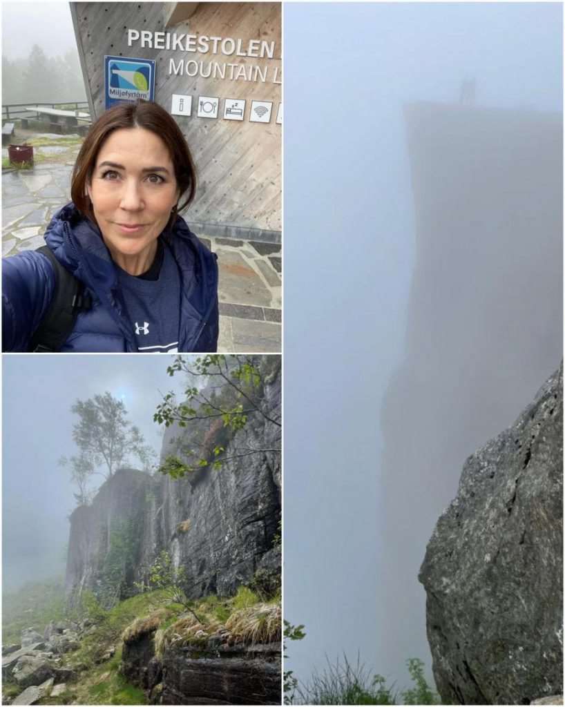 Kronprinsesse Mary av Danmark besøkte Preikestolen utenfor Stavanger torsdag. Besøket var preget av tåke på platået, men kronprinsesse Mary satte likevel pris på turen. Foto: Kronprinsesse Mary av Danmark / NTB