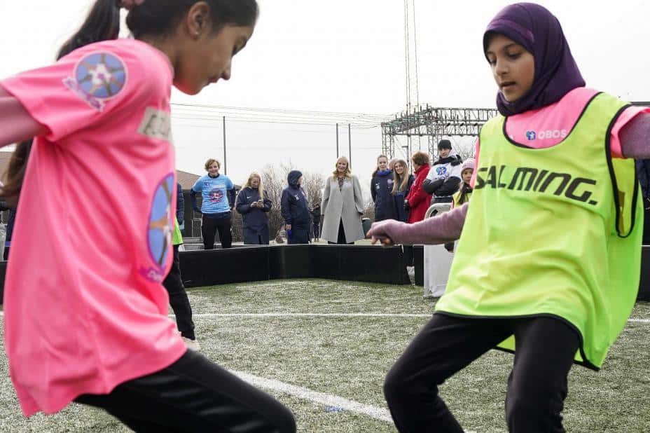 Der fikk kronprinsessen blant annet se jentene spille fotball og leke og høre mer om prosjektet. Også Oslo-ordfører Marianne Borgen (SV) var til stede.