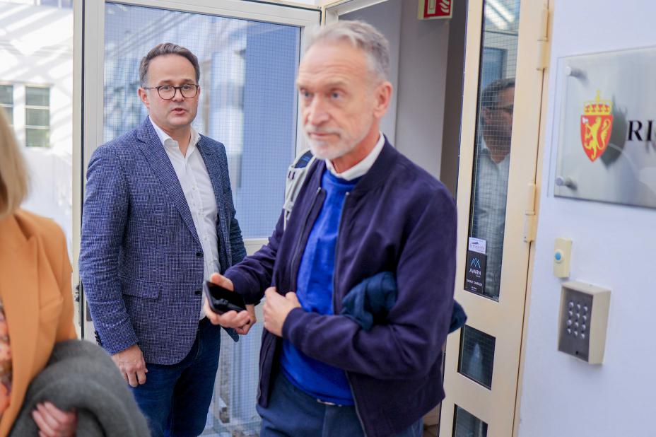 Riksmekler Mats Wilhelm Ruland og Tor Arne Gangsø i YS etter møtet mellom partene i lærerstreiken på Riksmeklerens kontor i Oslo lørdag. Foto: Alf Simensen / NTB