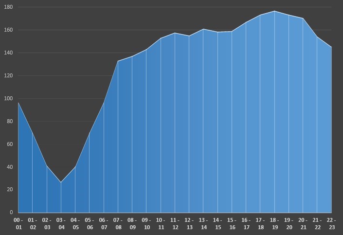 Utover morgenen stiger prisene raskt og før klokken blir 18 på kvelden har prisen kommet opp i 1 krone og 77 øre per kilowattime med avgifter.