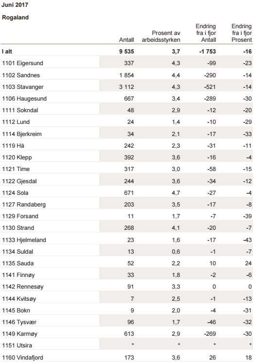 Arbeidsledigheten i Haugesund er nå nede i 3,4 %, Karmøy har 2,9 % og Tysvær har kun 1,7 % arbeidsledighet. Det har vært en markant nedgang i antallet helt arbeidsledige det siste året.