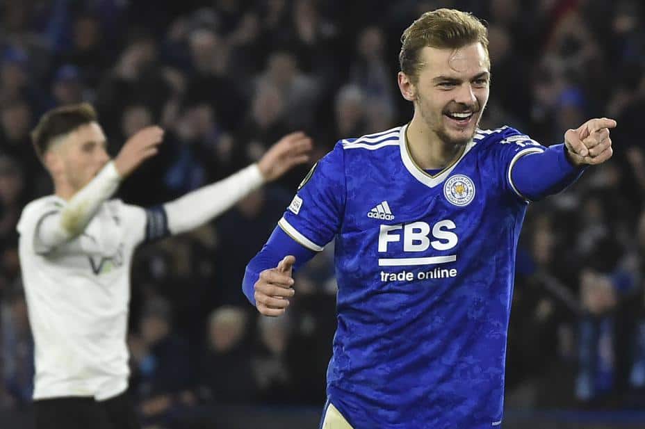 Kiernan Dewsbury-Hall noterte seg for en scoring mot Randers torsdag. Foto: Rui Vieira / AP / NTB