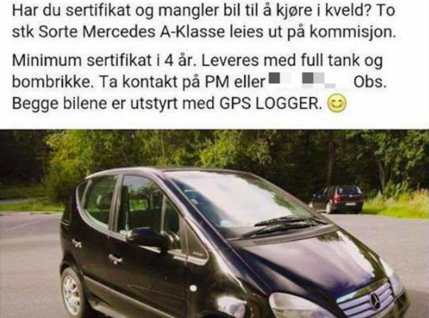 På en Facebook-post skriver han at han leier ut to Mercedeser på kommisjon hvis noen ønsker å kjøre, men ikke har bil. Bilene er GPS-logget, skriver han ifølge avisa.