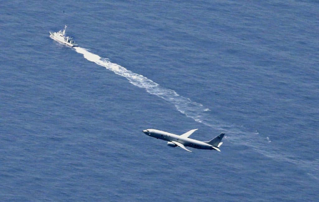 Et fartøy fra den japanske kystvakten og et amerikansk militærfly leter etter F-35-flyet som styrtet i Japan 9. april. Flyskroget er fortsatt ikke funnet. Foto: Kyodo News via AP / NTB scanpix