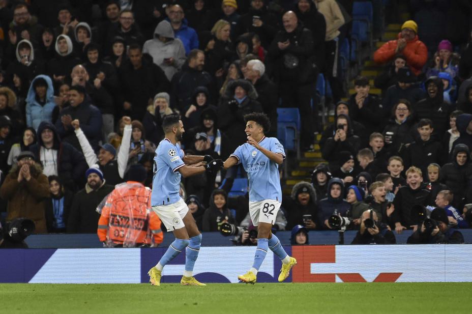 Manchester Citys Rico Lewis var i ekstase etter å ha scoret 1-1-målet mot Sevilla. Han gratuleres av lagkamerat Riyad Mahrez. Foto: Rui Vieira / AP / NTB