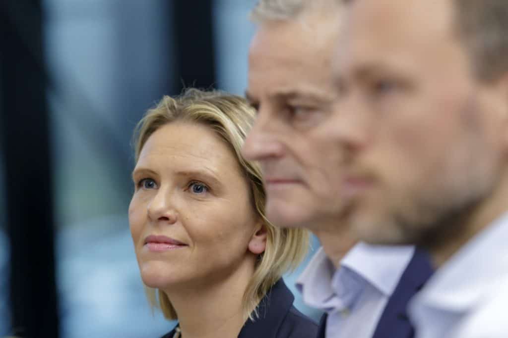 Sylvi Listhaug (t.v.) får ingen gratulasjoner fra Ap-leder Jonas Gahr Støre (i midten) for at hun får ny jobb som eldreminister. Han er kritisk til politikken hun førte som eldrebyråd i Oslo og til at hun kommer inn i varmen igjen bare ett år etter at hun måtte gå av. Til høyre skimtes SV-leder Audun Lysbakken. Arkivfoto: Cornelius Poppe / NTB scanpix