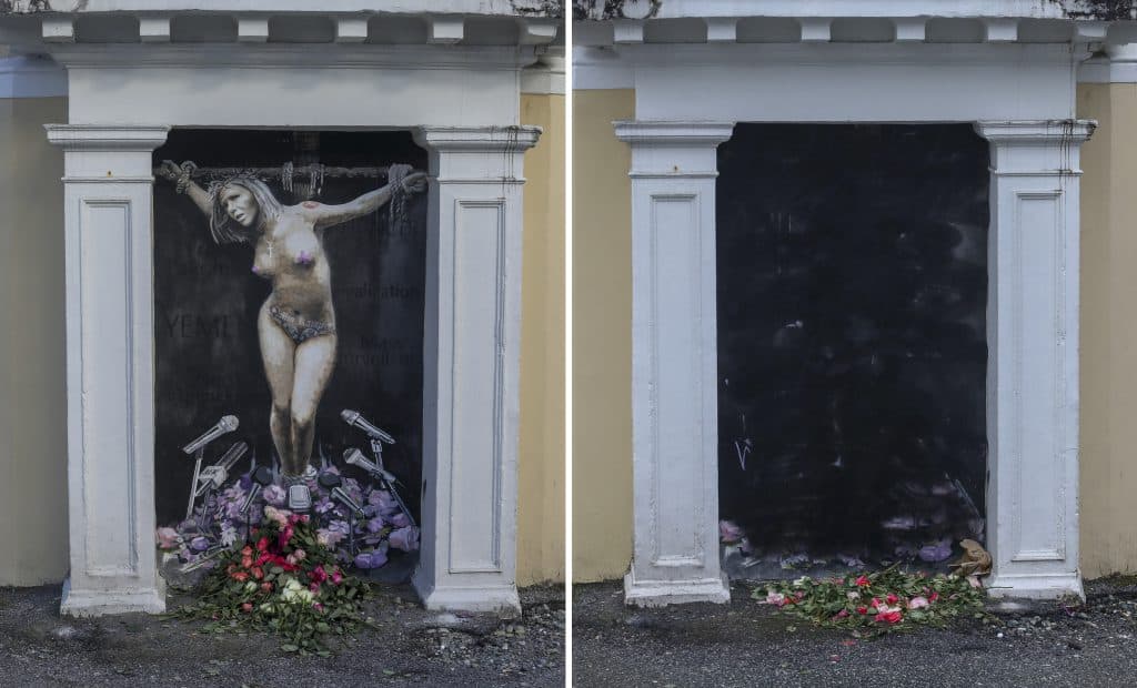 Kunstneren selv har lagt et bilde ut på Instagram natt til onsdag. Der er bildet tagget, men ikke helt overmalt, slik det er onsdag morgen.