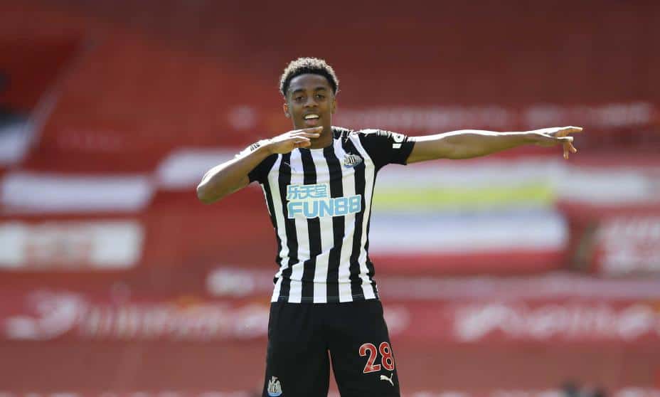 Newcastles Joe Willock feirer etter 1-1-scoringen mot Liverpool på overtid. Foto: David Klein / AP / NTB.