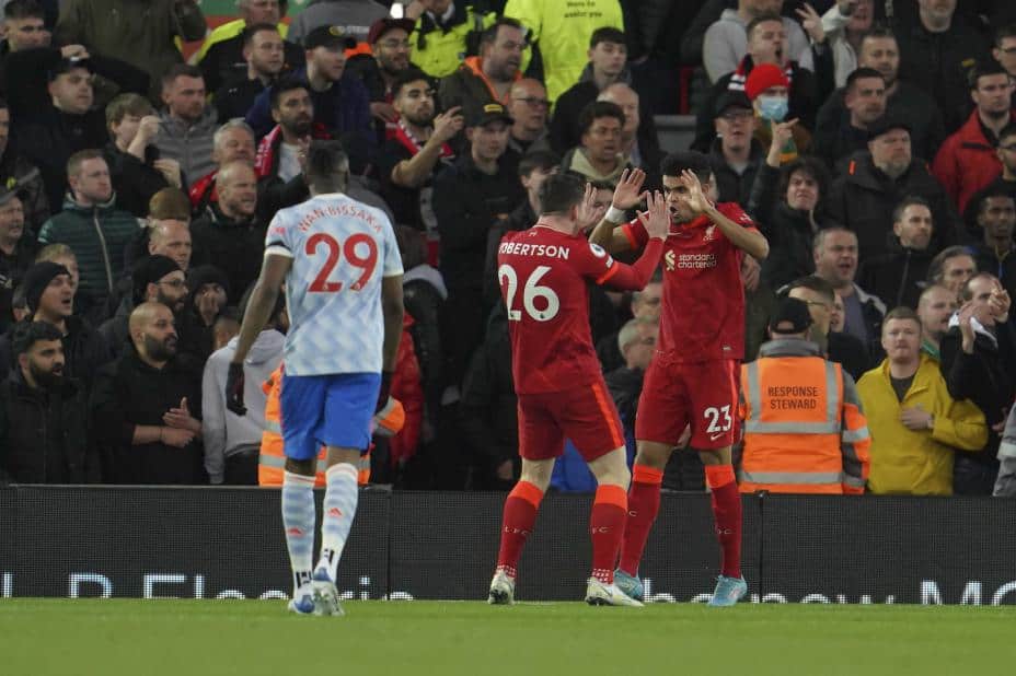 Liverpool utnyttet tidlig den svake forsvarslinjen til Manchester United, da flere spillere ble sendt i bakrom der Mohamed Salah enkelt kunne servere Diaz alene foran mål. Januarsigneringen kunne enkelt sette sitt fjerde mål i Liverpool-drakt.