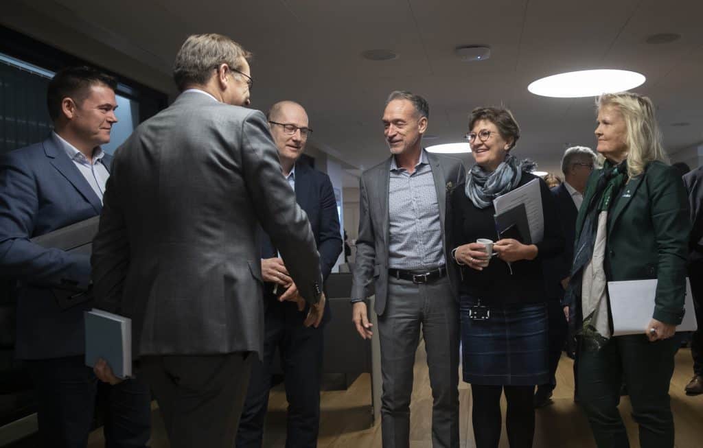 F.v.: Jan Olav Birkenhagen (Akademikerne), Steffen Handal (Unio), Tor Arne Gangsø (KS), Mette Nord (LO), Lizzie Ruud Thorkildsen (YS) og Lasse Hansen (adm.dir. i KS) som hilser på forhandlingslederne under forhandlingsstart i kommuneoppgjøret. Foto: Berit Roald / NTB scanpix