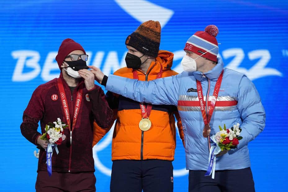 Etter den nederlandske nasjonalsangen hjalp Lorentzen den canadiske sølvvinneren å justere munnbindet, som ikke satt riktig. Dubreuil ga ham tommel opp før de tre 29-åringene poserte sammen.