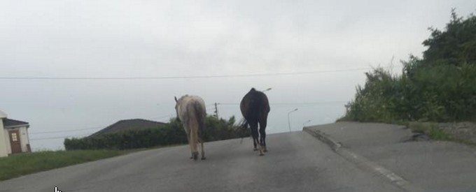 Løse hester i Åkra sentrum